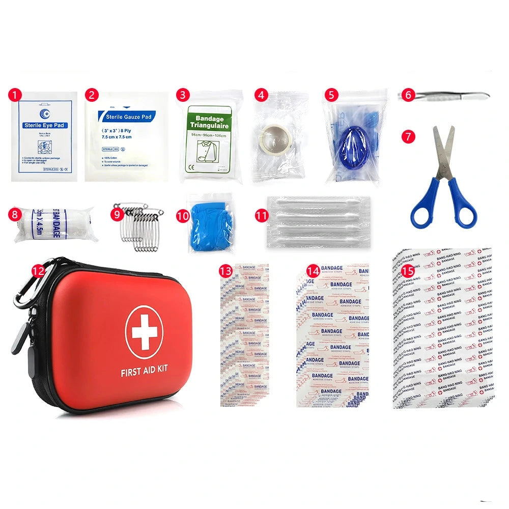 - Contenu 90 pièces (kit complet) : cache-œil stérile (1), masque RCP jetable (1), épingles de sûreté (10), pansements papillon PE (20), compresse de gaze stérile (1), pince à épiler (1), gants (1), pansements PE (20), bandage triangulaire (1), ciseaux (1), cotons-tiges (10), bandage non tissé (20), sparadrap non tissé (1), bande PBT (1), étui de transport (1).